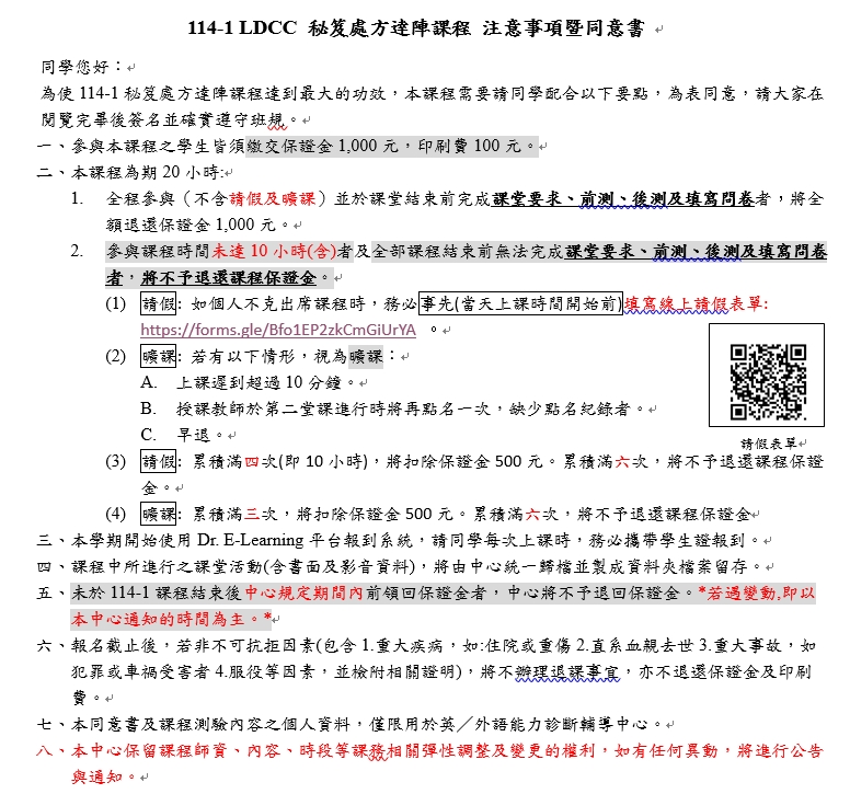 *此資訊已同步透過email通知所有報名課程之同學,保證金領取條件及扣費標準皆同開課前簽屬之同意書內容。(請參考附圖)*
