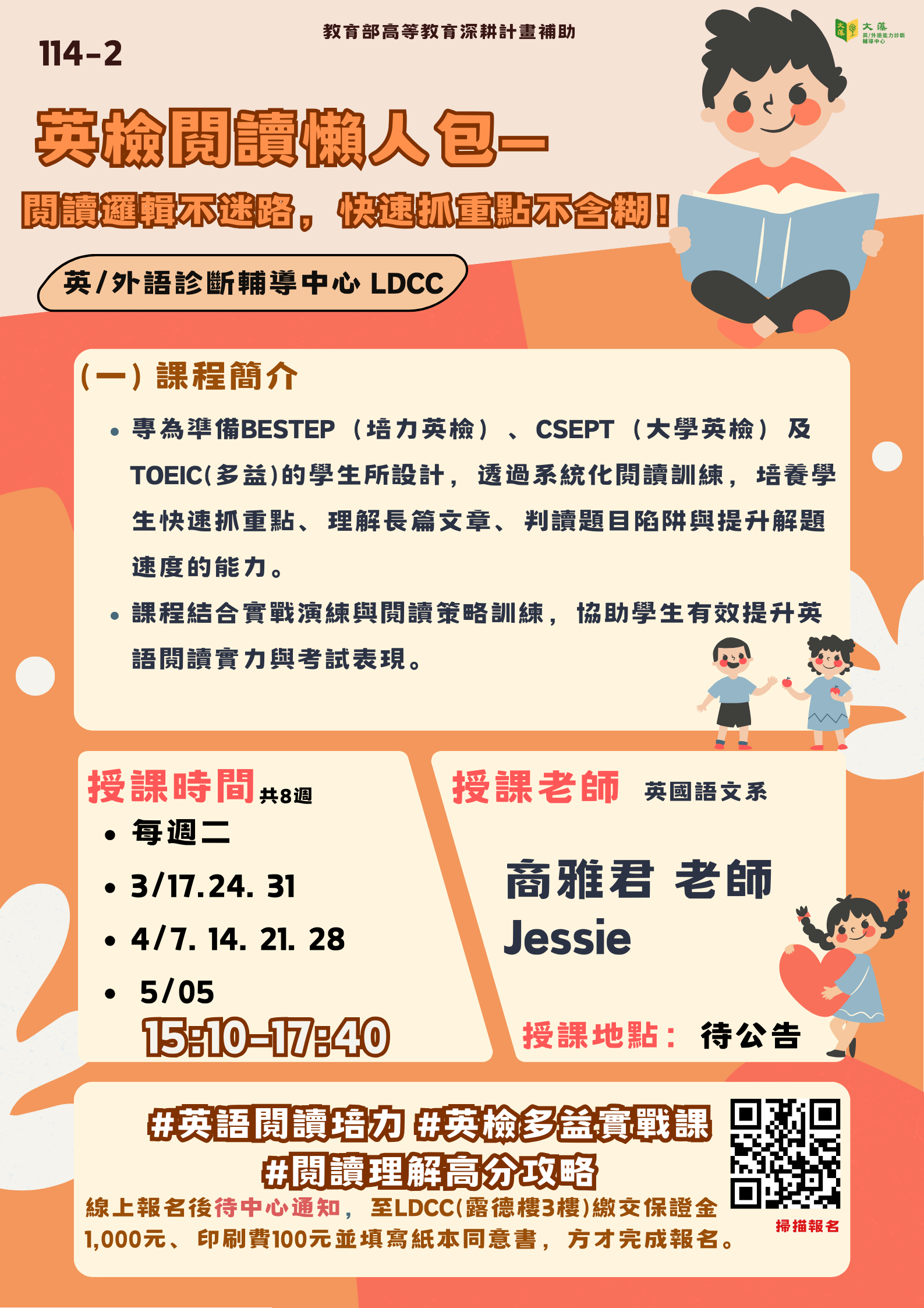 專為準備BESTEP(培力英檢)、CSEPT(大學英檢)及TOEIC(多益)的學生所設計,透過系統化閱讀訓練,培養學生快速抓重點、理解長篇文章、判讀題目陷阱與提升解題速度的能力。